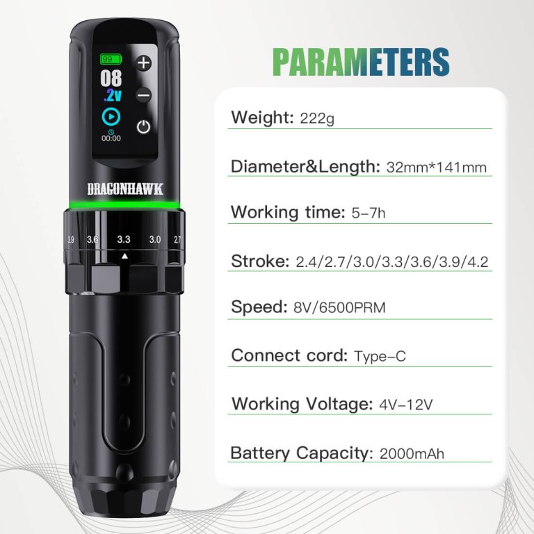 • 7 Ayarlanabilir Stroke Seçeneği: Hızlı çevirme ayar düğmesi sayesinde 2,5–4,5 mm stroke aralığında kolayca geçiş yaparak her dövme stiline uyum sağlar.